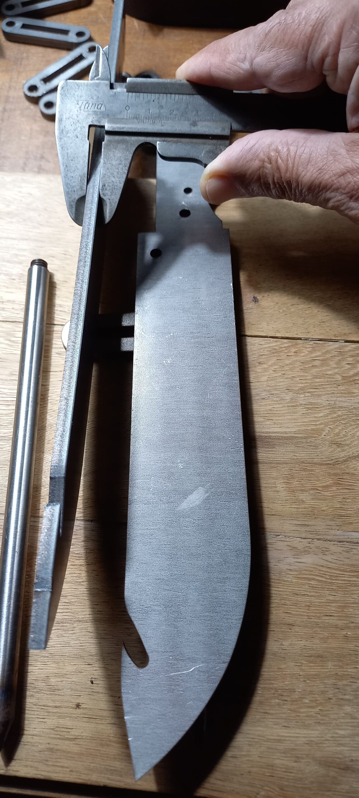 01 (uma) Alavanca de 400 mm x 100 mm x 12,7 mm, confeccionada em aço 1045, 5160, já com alivio de tensões, usinada em CNC, gravação de logo em INPI com número de série, limpeza, Tempera/revenir 40 /44 HRC afiação e oxidação