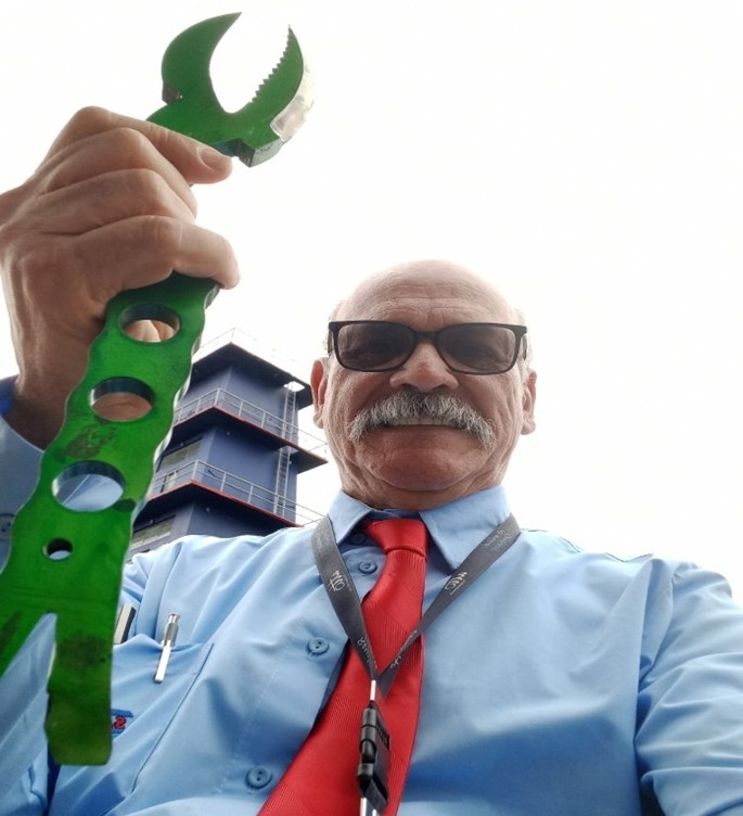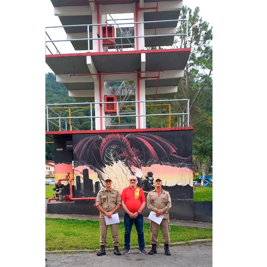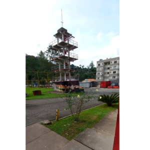 Alavanca SALEM, na mão do seu criador Itamar Cunha Salem, ao fundo o Símbolo do Saber (Torre de Técnicas em alturas) ABM Academia Militar CBMRS Porto Alegre – RS – Brasil