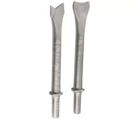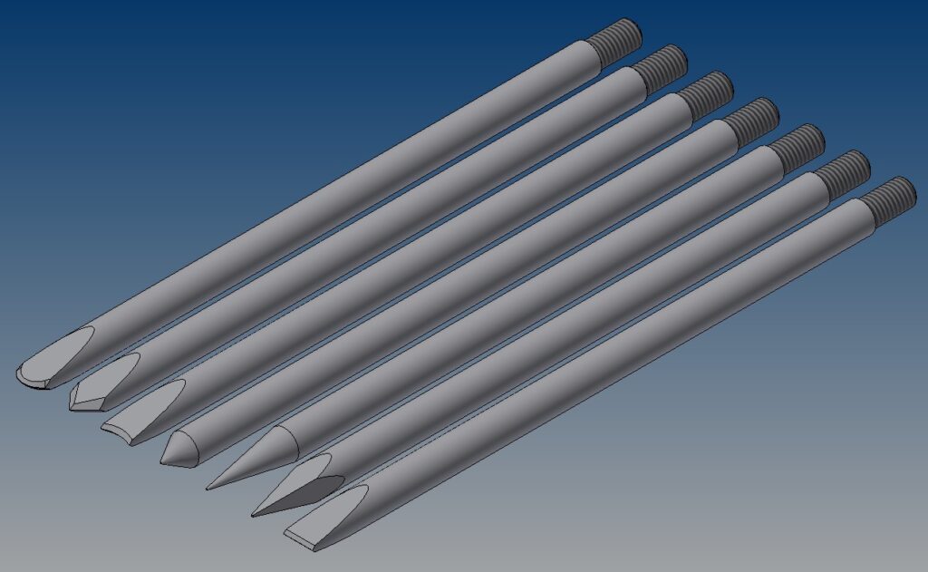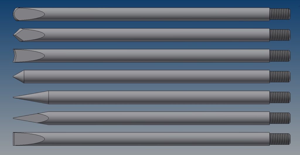 7) Talhadeira reta em aço 1060 de 3/8” de diâmetro com rosca de 8mm, ponta talhadeira com 200 mm de comprimento, afiada.
